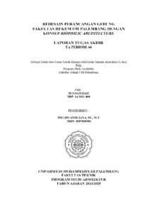 Fakultas Hukum Universitas Muhammadiyah Palembang (FH UM Palembang) merupakan salah satu institusi pendidikan tinggi yang berperan penting dalam pengembangan ilmu hukum di Sumatera Selatan. Seiring meningkatnya jumlah mahasiswa dan kompleksitas aktivitas akademik, kebutuhan akan fasilitas fisik yang representatif semakin mendesak. Gedung eksisting Fakultas Hukum masih memiliki keterbatasan dalam pencahayaan alami, ventilasi silang, serta kualitas ruang terbuka. Penelitian ini menawarkan redesain gedung dengan pendekatan Biophilic Architecture sebagai solusi strategis. Konsep biophilik dipilih karena menekankan keterhubungan manusia dengan alam melalui integrasi elemen alami seperti vegetasi, cahaya matahari, sirkulasi udara alami, material organik, dan akses visual ke lingkungan sekitar. Metode yang digunakan meliputi observasi lapangan, studi literatur, serta studi banding pada bangunan sejenis. Hasil perancangan menghasilkan gedung pendidikan tinggi yang kontekstual dengan iklim tropis, mengakomodasi kebutuhan program S1, S2, dan potensi pengembangan S3, serta tetap selaras dengan nilai-nilai Islami.