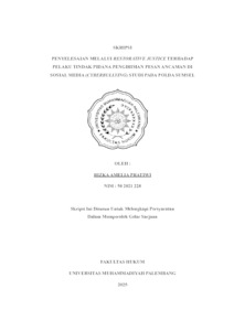 ABSTRAK PENYELESAIAN MELALUI RESTORATIVE JUSTICE TERHADAP PELAKU TINDAK PIDANA PENGIRIMAN PESAN ANCAMAN DI SOSIAL MEDIA (CYBERBULLYING) STUDI PADA POLDA SUMSEL RIZKA AMELIA PRATIWI Cyberbullying atau intimidasi digital didefinisikan sebagai praktik agresif yang memanfaatkan teknologi komunikasi untuk menyerang individu tanpa memandang kategori usia. Salah satu bentuk penyalahgunaan media sosial adalah pengiriman pesan ancaman yang termasuk dalam tindak pidana cyberbullying. Penelitian ini bertujuan untuk menganalisis penyelesaian restorative justice terhadap pelaku pengiriman pesan ancaman di media sosial berdasarkan Undang-Undang Nomor 11 Tahun 2008 tentang Informasi dan Transaksi Elektronik (UU ITE) beserta perubahannya, serta mengkaji penerapan pendekatan restorative justice sebagai alternatif penyelesaian perkara. Metode penelitian yang digunakan adalah empiris dengan pendekatan perundang-undangan dan pendekatan kasus. Data diperoleh melalui studi kepustakaan, analisis peraturan perundang-undangan, serta wawancara dengan aparat penegak hukum pada Subdit Siber Polda Sumatera Selatan. Hasil penelitian menunjukkan bahwa pengiriman pesan ancaman di media sosial diatur dalam Pasal 29 UU ITE jo. Pasal 45B, yang memberikan ancaman pidana penjara paling lama 4 tahun dan/atau denda paling banyak Rp750.000.000. Namun, dalam praktiknya penegakan hukum menghadapi kendala, antara lain keterbatasan sumber daya penyidik, sulitnya melacak pelaku yang menggunakan identitas palsu, serta rendahnya literasi digital masyarakat. Penerapan restorative justice berdasarkan Perpol No. 8 Tahun 2021 dapat menjadi solusi dalam penyelesaian kasus tertentu, khususnya jika melibatkan pelaku anak atau pelajar, dengan syarat adanya kesepakatan damai antara pelaku dan korban. Kesimpulan penelitian ini menegaskan bahwa sanksi pidana memiliki peran penting dalam memberikan efek jera, namun penerapan restorative justice juga diperlukan untuk memberikan pemulihan bagi korban dan menekan dampak psikologis. Oleh karena itu, diperlukan peningkatan kapasitas aparat penegak hukum dalam bidang forensik digital, penguatan literasi digital masyarakat, serta optimalisasi mekanisme mediasi dalam penyelesaian kasus cyberbullying. Kata Kunci: Restorative justice, tindak pidana, ancaman, media sosial