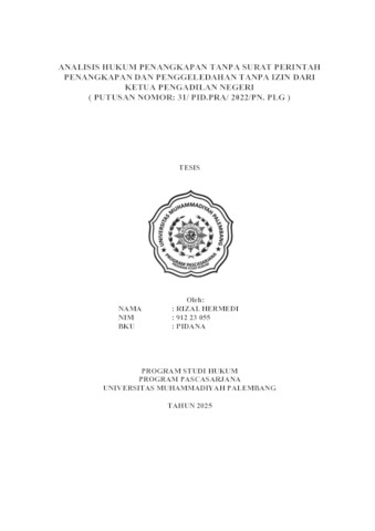 RIZAL HERMEDI, NIM : 91223055 (2025) ANALISIS HUKUM PENANGKAPAN TANPA SURAT PERINTAH PENANGKAPAN DAN PENGGELEDAHAN TANPA IZIN DARI KETUA PENGADILAN NEGERI ( PUTUSAN NOMOR: 31/ PID.PRA/ 2022/PN. PLG ). Masters thesis, Universitas Muhammadiyah Palembang.