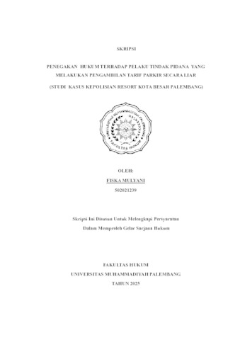 ABSTRAK PENEGAKAN HUKUM TERHADAP PELKU TINDAK PIDANA YANG MELAKUKAN PENGAMBILAN TARIF PARKIR SECARA LIAR (STUDI KASUS KEPOLISIAN RESORT KOTA BESAR PALEMBANG) FISKA MULYANI Penegakan hukum merupakan upaya untuk mewujudkan nilai-nilai dan pedoman hukum dalam mencapai suatu, keadilan, kedamaian dan ketertiban dalam kehidupan. Apabila seseorang melakukan perbuatan yang melanggar hukum dan aturan, maka akan dikenakan sanksi pidana sebagai bentuk tanggung jawab. Oleh karena itu di Kota Palembang masih sering terjadi praktik pungutan parkir liar maka dari itu perlunya penegakan hukum. Parkir merupakan salah satu komponen atau aspek tak terpisahkan dalam kehidupan dan kebutuhan sistem transport, karena di setiap perjalanan dengan kendaraan pribadi umumnya selalu dimulai dan diakhri tempat parkir. Akan tetapi masih banyak juru parkir liar yang artinya belum ada surat izin resmi dari pemerintahan Kota Palembang. Pungutan liar (pungli) adalah salah satu sanksi pidana yang telah diatur dalam Pasal 368 dan 335 Ayat 1 KUHP. Pungutan liar adalah suatu tindak pidana yang sengaja melakukan mengumpulkan uang secara tidak sah dalam jumlah tertentu dengan tujuan memperoleh keuntungan diri sendiri atau orang lain. Penelitian ini bertujuan untuk menganalisis penegakan hukum terhadap pelaku tindak pidana yang melakukan pengambilan tarif parkir secara liar di kota palembang. Penelitian ini mengunakan metode empiris atau penelitian yang langsung mengumpulkan data melalui, wawancara dan observasi. Hasil penelitian ini menunjukkan bahwa upaya Kepolisian Polrestabes Palembang dalam menanggulangi tindak pidana pemungutan liar yang dilakukan oleh juru parkir liar yang dapat dilihat dari upaya yang dilakukan antara lain upaya Pre Emtif berupa melakukan sosialisasi pada masyarakat. Kemudian upaya preventif berupa berupa patroli serta pengawasan secara rutin. Selanjutnya upaya respresif Kepolisian Polrestabes Palembang melakukan proses acara pemeriksaan cepat. Adapun hambatan Kepolisian Polrestabes Palembang dalam menanggulangi tindak pidana pemungutan liar oleh juru parkir, yaitu masyarakat lebih tertutup dan tidak memberikan laporan aduan, banyak pelaku juru parkir liar yang melarikan diri,masih banyaknya juru parkir liar yang tidak memiliki surat izin resmi. ABSTRAK PENEGAKAN HUKUM TERHADAP PELKU TINDAK PIDANA YANG MELAKUKAN PENGAMBILAN TARIF PARKIR SECARA LIAR (STUDI KASUS KEPOLISIAN RESORT KOTA BESAR PALEMBANG) FISKA MULYANI Penegakan hukum merupakan upaya untuk mewujudkan nilai-nilai dan pedoman hukum dalam mencapai suatu, keadilan, kedamaian dan ketertiban dalam kehidupan. Apabila seseorang melakukan perbuatan yang melanggar hukum dan aturan, maka akan dikenakan sanksi pidana sebagai bentuk tanggung jawab. Oleh karena itu di Kota Palembang masih sering terjadi praktik pungutan parkir liar maka dari itu perlunya penegakan hukum. Parkir merupakan salah satu komponen atau aspek tak terpisahkan dalam kehidupan dan kebutuhan sistem transport, karena di setiap perjalanan dengan kendaraan pribadi umumnya selalu dimulai dan diakhri tempat parkir. Akan tetapi masih banyak juru parkir liar yang artinya belum ada surat izin resmi dari pemerintahan Kota Palembang. Pungutan liar (pungli) adalah salah satu sanksi pidana yang telah diatur dalam Pasal 368 dan 335 Ayat 1 KUHP. Pungutan liar adalah suatu tindak pidana yang sengaja melakukan mengumpulkan uang secara tidak sah dalam jumlah tertentu dengan tujuan memperoleh keuntungan diri sendiri atau orang lain. Penelitian ini bertujuan untuk menganalisis penegakan hukum terhadap pelaku tindak pidana yang melakukan pengambilan tarif parkir secara liar di kota palembang. Penelitian ini mengunakan metode empiris atau penelitian yang langsung mengumpulkan data melalui, wawancara dan observasi. Hasil penelitian ini menunjukkan bahwa upaya Kepolisian Polrestabes Palembang dalam menanggulangi tindak pidana pemungutan liar yang dilakukan oleh juru parkir liar yang dapat dilihat dari upaya yang dilakukan antara lain upaya Pre Emtif berupa melakukan sosialisasi pada masyarakat. Kemudian upaya preventif berupa berupa patroli serta pengawasan secara rutin. Selanjutnya upaya respresif Kepolisian Polrestabes Palembang melakukan proses acara pemeriksaan cepat. Adapun hambatan Kepolisian Polrestabes Palembang dalam menanggulangi tindak pidana pemungutan liar oleh juru parkir, yaitu masyarakat lebih tertutup dan tidak memberikan laporan aduan, banyak pelaku juru parkir liar yang melarikan diri,masih banyaknya juru parkir liar yang tidak memiliki surat izin resmi. Kata Kunci: Penegakan Hukum, Tindak Pidana, Pungutan Lia