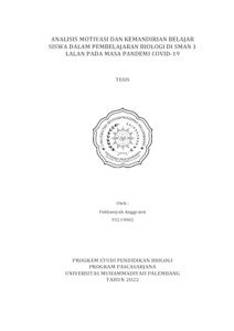 Abstrak Anggraini, Fiddaniyah. 2022. Analisis Motivasi dan Kemandirian Belajar Siswa dalam Pembelajaran Biologi SMAN 1 Lalan pada Masa Pandemi Covid-19. Tesis, Program Pascasarjana Pendidikan Biologi, Program Pascasarjana Strata II Universitas Muhammadiyah Palembang. Pembimbing : (1) Dr. Sri Wardhani, M.Si, (2) Dr. Haryadi,M.Pd. Penelitian ini bertujuan untuk menganalisis dan menentukan faktor-faktor yang memengaruhi motivasi dan kemandirian belajar biologi siswa di SMAN 1 Lalan selama pandemi Covid-19. Metode penelitian yang digunakan adalah deskriptif kualitatif. Subjek penelitian ini adalah siswa kelas X IPA, XI IPA, dan XII IPA, serta guru biologi. Pengumpulan data dilakukan melalui observasi langsung, angket siswa melalui Google Form, dan wawancara langsung dengan guru dan siswa. Analisis data dilakukan dengan menggunakan teknik analisis interaktif Miles dan Huberman. Hasil penelitian menunjukkan bahwa motivasi belajar siswa berada dalam kategori tinggi. Meskipun beberapa siswa kesulitan memahami materi dan terkadang mengantuk akibat proses pembelajaran daring, siswa berusaha untuk tetap bersemangat dalam belajar. Kemandirian belajar siswa juga berada dalam kategori tinggi, mereka berusaha untuk mengikuti proses pembelajaran daring. Meskipun akses internet terkadang terhambat sinyal, masih ditemukan siswa yang tidak memiliki laptop dan ponsel. Hal ini menunjukkan bahwa faktor-faktor yang memengaruhi motivasi belajar dan kemandirian belajar siswa dalam pembelajaran biologi daring di SMAN 1 Lalan meliputi tujuan yang ingin dicapai, keinginan untuk berhasil, kondisi siswa, kesulitan mengakses internet, peran orang tua, dan peran lingkungan belajar mengajar. Kata kunci: motivasi belajar; kemandirian belajar; pembelajaran daring