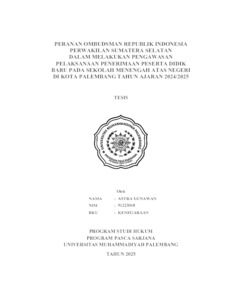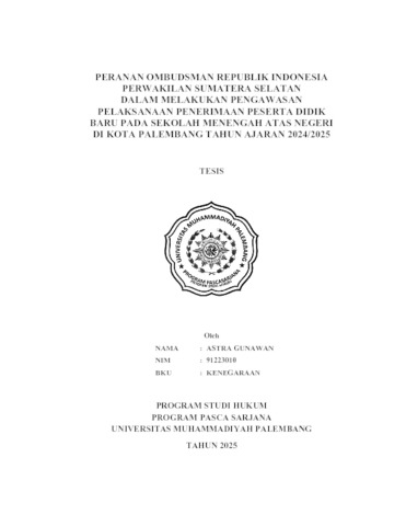ASTRA GUNAWAN, NIM : 91223010 (2025) PERANAN OMBUDSMAN REPUBLIK INDONESIA PERWAKILAN SUMATERA SELATAN DALAM MELAKUKAN PENGAWASAN PELAKSANAAN PENERIMAAN PESERTA DIDIK BARU PADA SEKOLAH MENENGAH ATAS NEGERI DI KOTA PALEMBANG TAHUN AJARAN 2024/2025. Masters thesis, Universitas Muhammadiyah Palembang.