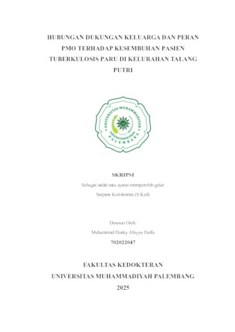 MUHAMMAD DZAKY ABIYYU DAFFA, NIM: 702022047 (2025) HUBUNGAN DUKUNGAN KELUARGA DAN PERAN PMO TERHADAP KESEMBUHAN PASIEN TUBERKULOSIS PARU DI KELURAHAN TALANG PUTRI. Skripsi thesis, Universitas Muhammadiyah Palembang.