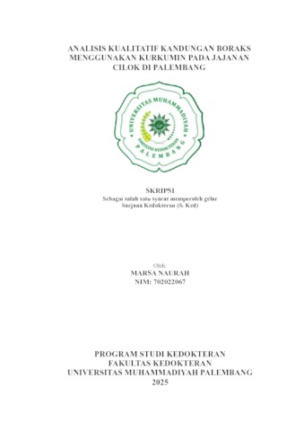 MARSA NAURAH, NIM. 702022067 (2025) ANALISIS KUALITATIF KANDUNGAN BORAKS MENGGUNAKAN KURKUMIN PADA JAJANAN CILOK DI PALEMBANG. Skripsi thesis, UNIVERSITAS MUHAMMADIYAH PALEMBANG.