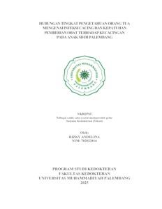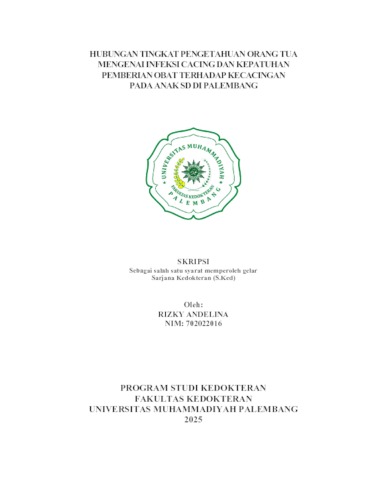RIZKY ANDELINA, NIM. 702022016 (2025) HUBUNGAN TINGKAT PENGETAHUAN ORANG TUA MENGENAI INFEKSI CACING DAN KEPATUHAN PEMBERIAN OBAT TERHADAP KECACINGAN PADA ANAK SD DI PALEMBANG. Skripsi thesis, Universitas Muhammadiyah Palembang.