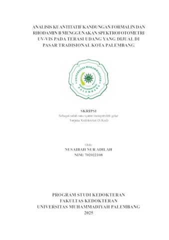 NUSAIBAH NUR ADILAH, NIM. 702022108 (2025) ANALISIS KUANTITATIF KANDUNGAN FORMALIN DAN RHODAMIN B MENGGUNAKAN SPEKTROFOTOMETRI UV-VIS PADA TERASI UDANG YANG DIJUAL DI PASAR TRADISIONAL KOTA PALEMBANG. Skripsi thesis, Universitas Muhammadiyah Palembang.