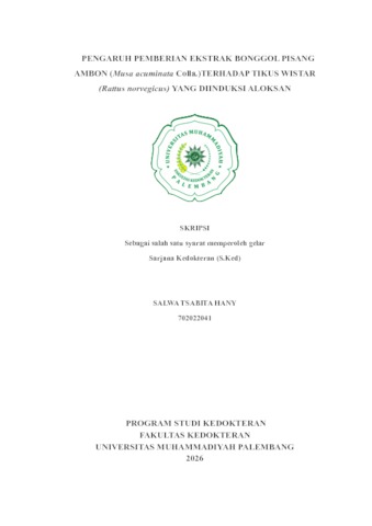 SALWA TSABITA HANY, NIM.702022041 (2026) PENGARUH PEMBERIAN EKSTRAK BONGGOL PISANG AMBON (Musa acuminata Colla.)TERHADAP TIKUS WISTAR (Rattus norvegicus) YANG DIINDUKSI ALOKSAN. PENGARUH PEMBERIAN EKSTRAK BONGGOL PISANG AMBON (Musa acuminata Colla.)TERHADAP TIKUS WISTAR (Rattus norvegicus) YANG DIINDUKSI ALOKSAN. (Unpublished)
