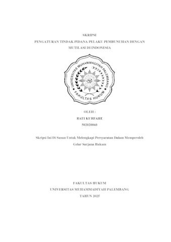PENGATURAN TINDAK PIDANA PELAKU PEMBUNUHAN DENGAN MUTILASI DI INDONESIA Rati Kurfahe Nim. 502020060 ABSTRAK Mutilasi diartikan sebagai kegiatan pemotongan menjadi beberapa bagian, yang biasanya dilakukan pada tubuh manusia atau hewan. Belakangan ini istilah “mutilasi” sering digunakan khususnya oleh khalayak umum untuk menunjukkan tindakan pembunuhan atau penghilangan nyawa yang diikuti dengan kekerasan yang berupa mutilasi pada bagian tubuh korbannya. Permasalahan yang dibahas dalam penelitian ini adalah 1) Pengaturan tindak pidana pembunuhan dengan mutilasi di Indonesia 2) Sanksi pelaku tindak pidana pembunuhan dengan mutilasi di Indonesia. Penelitian dilakukan dengan hukum normatif, jenis penelitian yang mengarah kepada kajian kepustakaan, di mana literatur digunakan sebagai bahan utama untuk analisis. Penelitian ini dilakukan dengan menelaah sumber-sumber kepustakaan, termasuk aturan UU dan norma yang berlaku dalam masyarakat. Berdasarkan hasil peneliitian dalam skripsi ini menunjukan bahwa Sanksi pelaku tindak pidana pembunuhan dengan mutilasi di indonesia adalah pasal 351 KUHP mengatur tentang penganiayaan yang mengakibatkan korban meninggal dunia, Ancaman hukuman yang diatur dalam pasal 351 ayat 3 KUHP adalah pidana penjara paling lama 7 tahun penjara, di Indonesia belum adanya sanksi khusus yang mengatur mengenai kasus mutilasi ini. Kata Kunci : Pembunuhan, Mutilasi, Hukum Pidana
