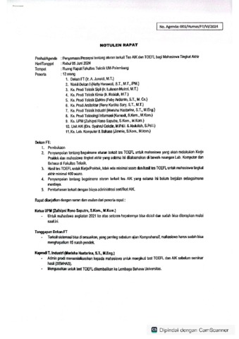 FAKULTAS TEKNIK, FT UMP (2024) NOTULEN RAPAT_PENYAMAAN PRESEPSI TENTANG ATURAN TERKAIT TES AIK DAN TOEFL BAGI MAHASISWA TINGKAT AKHIR. FAKULTAS TEKNIK UNIVERSITAS MUHAMMADIYAH PALEMBANG.