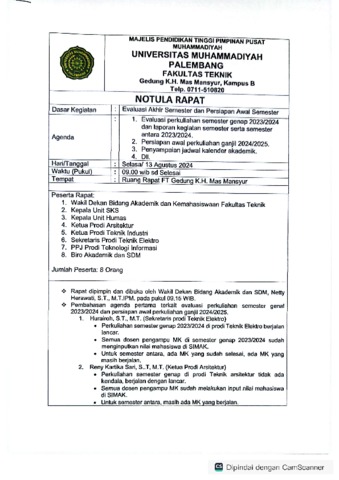FAKULTAS TEKNIK, FT UMP (2024) EVALUASI AKHIR SEMESTER GENAP T.A.2023/2024 DAN PERSIAPAN AWAL SEMESTER GANJIL T.A.2024/2025. FAKULTAS TEKNIK UNIVERSITAS MUHAMMADIYAH PALEMBANG.