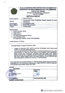 FAKULTAS TEKNIK, FT UMP (2025) PEMBAHASAN ULANG PENGELOLAAN MAPALA HIAWATA DI FT UM PALEMBANG. FAKULTAS TEKNIK UNIVERSITAS MUHAMMADIYAH PALEMBANG.