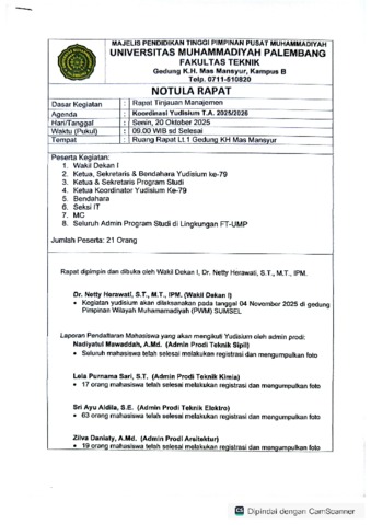 FAKULTAS TEKNIK, FT UMP (2025) KOORDINASI YUDISIUM TAHUN AJARAN 2025/2026. FAKULTAS TEKNIK UNIVERSITAS MUHAMMADIYAH PALEMBANG.
