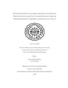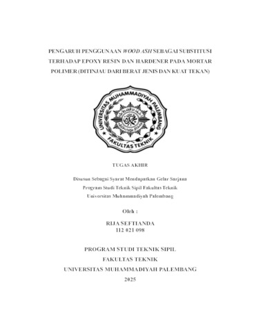 RIJA SEFTIANDA, NIM. 112021098 (2025) PENGARUH PENGGUNAAN WOOD ASH SEBAGAI SUBSTITUSI TERHADAP EPOXY RESIN DAN HARDENER PADA MORTAR POLIMER (DITINJAU DARI BERAT JENIS DAN KUAT TEKAN). Skripsi thesis, Universitas Muhammadiyah Palembang.