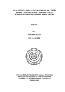 ABSTRAK Husna, HidaYati. 2025. Analisis Gaya Bahasa dan Makna dalam Cerpen Rumah yang Terang Karya Ahmad Tohari Sebagai Media Pembelajaran Karya Sastra. Skripsi, Program Studi Bahasa Indonesia Program Sarjana (S1). Fakultas Keguruan dan Ilmu Pendidikan. Universitas Muhammadiyah Palembang. Pembimbing I, Dr. H. Haryadi,M.Pd. Pembimbing II, Surismiati, S.Pd., M.Pd. Kata Kunci: Gaya Bahasa, Makna Cerpen, Ahmad Tohari, Pembelajaran Sastra. Penelitian ini bertujuan untuk menganalisis Gaya Bahasa dan Makna dalam Cerpen rumah yang terang karya Ahmad Tohari serta mengkaji potensi sebagai media pembelajaran karya sastra. Penelitian ini mengidentifikasi dan menginterpretasi gaya bahasa yang digunakan dalam cerpen, serta makna yang terkandung di dalamnya penelitian ini menggunakan Metode deskriptif kualitatif dengan analisis stilistika dan semantik, Hasil Penelitian menunjukkan bahwa Ahmad Tohari menggunakan berbagai gaya bahasa, seperti metafora, personitikasi, hiperbola dan simbolisme, yang memeperkaya nilai estetika dan makna dalam cerita. Selain itu, makna yang terkandung dalam cerpen ini meliputi tema tentang kehidupan sosial, moralitas, dan refleksi atas nilai-nilai kemanusian, dengangaya bahasa yang khas dan makna yang kuat, Cerpen Rumah yang Terang berpotensi digunakan sebagai media pembelajaran karya sastra di sekolah. Cerpan ini dapat membantu siswa memahami unsur intrinsik dan ekstrinsik dalam sebuah karya sastra, serta meningkatkan apresiasi mereka terhadap sastra Indonesia.
