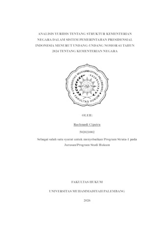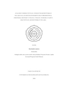 ABSTRAK ANALISIS YURIDIS TENTANG STRUKTUR KEMENTERIAN NEGARA DALAM SISTEM PEMERINTAHAN PRESIDENSIAL INDONESIA MENURUT UNDANG-UNDANG NOMOR 61 TAHUN 2024 TENTANG KEMENTERIAN NEGARA RACHMADI CIPUTRA Dasar pertimbangan dan kewenangan Presiden Republik Indonesia dalam menyusun struktur kementerian negara dalam kerangka sistem pemerintahan presidensial. Dalam sistem ini, Presiden memegang peran ganda sebagai kepala negara dan kepala pemerintahan dengan kewenangan luas, termasuk dalam menentukan jumlah, nama, dan fungsi kementerian serta pengangkatan dan pemberhentian menteri. Studi ini mengkaji aspek konstitusional dan praktik politik yang memengaruhi pembentukan kabinet, termasuk tantangan yang muncul akibat sistem multipartai dan kebutuhan koalisi politik. Penelitian juga menyoroti pentingnya prinsip meritokrasi yang mengedepankan integritas, kapabilitas, dan akseptabilitas dalam pemilihan menteri agar pemerintahan berjalan efektif, efisien, dan bebas dari praktik korupsi, kolusi, dan nepotisme (KKN). Selain itu, kajian ini menelaah perubahan regulasi terkait jumlah kementerian yang kini tidak lagi dibatasi secara ketat oleh undang-undang, memberikan fleksibilitas kepada Presiden dalam mengelola struktur pemerintahan. Hasil penelitian menunjukkan bahwa meskipun Presiden memiliki hak prerogatif yang luas, pelaksanaan kewenangan tersebut harus didasarkan pada tanggung jawab moral dan politik untuk memastikan kabinet yang profesional dan pemerintahan yang transparan serta berpihak pada kepentingan masyarakat. Penelitian ini merekomendasikan agar pembentukan kementerian dan pengangkatan menteri lebih mengutamakan kompetensi dan visi misi pemerintahan daripada pertimbangan politik semata. Kata kunci: Sistem Presidensial, Kewenangan Presiden, Struktur Kementerian,Kabinet, Politik Koalisi, KKN