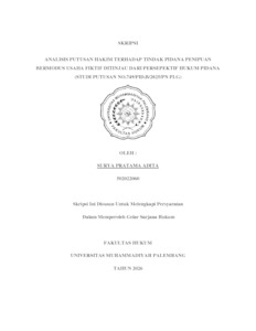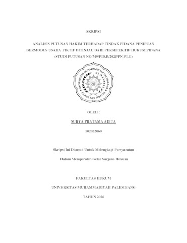 SURYA PRATAMA ADITA, NIM : 502022060 (2026) ANALISIS PUTUSAN HAKIM TERHADAP TINDAK PIDANA PENIPUAN BERMODUS USAHA FIKTIF DITINJAU DARI PERSEPEKTIF HUKUM PIDANA (STUDI PUTUSAN NO.749/PID.B/2025/PN PLG). Skripsi thesis, Fakultas Hukum.