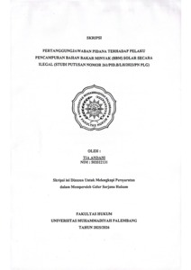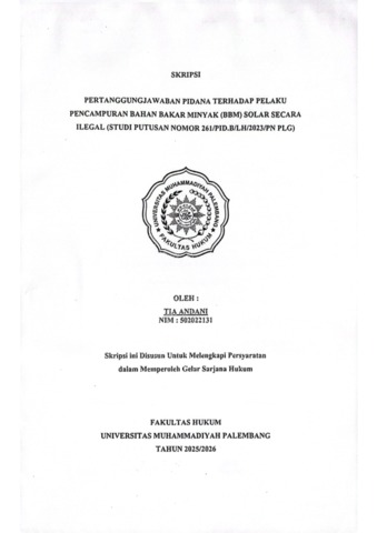 TIA ANDANI, NIM: 502022131 (2026) PERTANGGUNGJAWABAN PIDANA TERHADAP PELAKU PENCAMPURAN BAHAN BAKAR MINYAK (BBM) SOLAR SECARA ILEGAL (STUDI PUTUSAN NOMOR 261/PID.B/L,H/2023/PN PLG). Skripsi thesis, UNIVERSITAS MUHAMMADIYAH PALEMBANG.