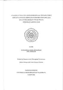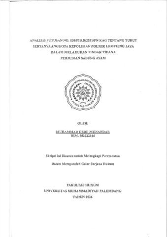 MUHAMMAD DEDE MUNANDAR, NIM.502022166 (2026) ANALISIS PUTUSAN NO.520/PID.B/2021/PN KAG TENTANG TURUT SERTANYA ANGGOTA KEPOLISIAN POLSEK LEMPUING JAYA DALAM MELAKUKAN TINDAK PIDANA PERJUDIAN SABUNG AYAM. Skripsi thesis, UNIVERSITAS MUHAMMADIYAH PALEMBANG.