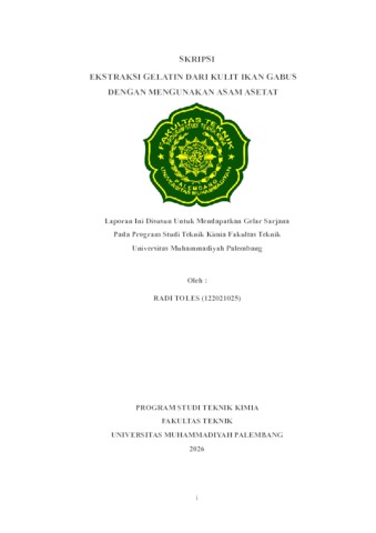EKSTRAKSI GELATIN DARI KULIT IKAN GABUS DENGAN MENGUNAKAN ASAM ASETAT (Radi Toles,2026) Program Studi Teknik Kimia, Fakultas Teknik, Universitas Muhammadiyah Palembang, Indonesia ABSTRAK Penelitian ini bertujuan untuk menganalisis pengaruh variasi suhu dan waktu ekstraksi terhadap rendemen serta karakteristik gelatin yang dihasilkan dari kulit ikan gabus ( Channa striata ) menggunakan pelarut asam asetat 0,2 M. Pemanfaatan kulit ikan gabus sebagai bahan baku gelatin merupakan alternatif sumber gelatin halal sekaligus upaya peningkatan nilai limbah industri perikanan. Proses penelitian dilakukan dengan perendaman 100 gram kulit ikan gabus kering dalam larutan asam asetat selama 1 jam, kemudian diekstraksi menggunakan aquadest pada variasi suhu 40°C, 50°C, 60°C, 70°C, dan 80°C dengan waktu ekstraksi 1, 3, dan 5 jam. Parameter yang dijelaskan meliputi rendemen (hasil), kadar protein, kadar udara, kadar abu, kadar lemak, pH, dan viskositas. Hasil penelitian menunjukkan bahwa rendemen gelatin berkisar antara 5,97%–20,94%, dengan nilai tertinggi pada suhu 70°C selama 3 jam sebesar 20,94%. Kadar protein berkisar antara 63,67%–93,39%, dengan nilai tertinggi yang diperoleh pada suhu 60°C selama 5 jam sebesar 93,39%. Nilai pH seluruh perlakuan sebesar 6,4 dan telah memenuhi standar SNI No. 06-3735-1995. Pada kondisi optimum (60°C selama 5 jam), diperoleh karakteristik gelatin berupa kadar udara 10,4%, kadar abu 2,3%, kadar lemak 5,52%, dan viskositas 6,5 cPs. Sebagian besar parameter telah memenuhi standar mutu SNI, kecuali kadar lemak yang masih relatif tinggi dibandingkan gelatin komersial. Kata kunci: kulit ikan gabus, gelatin, asam asetat, suhu ekstraksi, waktu ekstraksi karakterisasi mutu